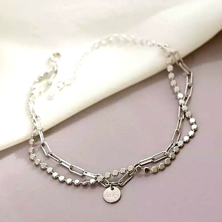 Layered Bracelet with Round Pendant (Silver)